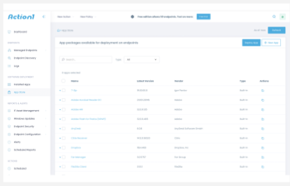 La tienda de aplicaciones Action1 RMM viene precargada con los instaladores de software más populares, como navegadores web, productos Abode, administradores de archivos y mensajería en línea. Todo lo que tiene que hacer es seleccionar un paquete para instalar; especificar los puntos finales de destino (por ejemplo, puede instalar un programa determinado solo en equipos con Windows 7); y elija el mejor momento para la implementación. El software de distribución Action1 RMM se encargará de la instalación remota por usted e incluso intentará reinstalar cualquier estación de trabajo que esté actualmente apagada.