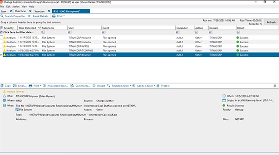 Rastree, audite e informe sobre eventos y cambios en tiempo real para mejorar el monitoreo de seguridad de EMC. Change Auditor for EMC proporciona seguimiento, auditoría, generación de informes y alertas en tiempo real para todos los cambios a fin de ayudar a garantizar la seguridad, el cumplimiento y el control de archivos y carpetas. Puede monitorear, informar y analizar fácilmente eventos y cambios mientras vigila los problemas de seguridad. Inmediatamente sabrá quién realizó qué cambios, cuándo y dónde, además de la estación de trabajo de origen, para mejorar el monitoreo de seguridad de EMC. Luego, puede generar automáticamente un análisis forense inteligente y detallado para todos los eventos de cambio para obtener una imagen de auditoría completa.